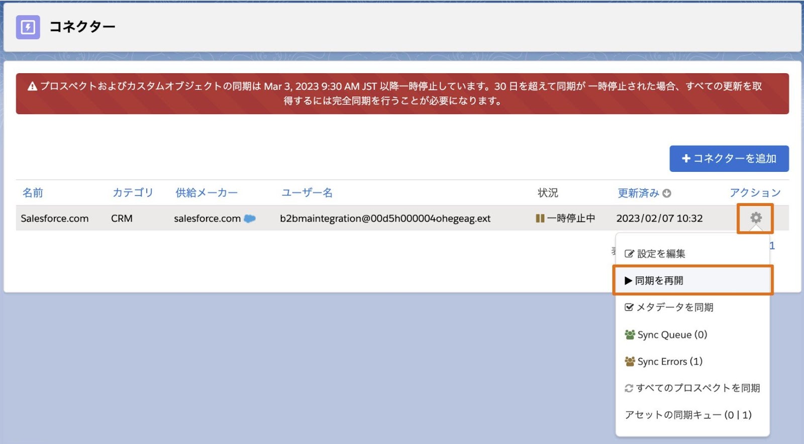 - ヘルプ記事|Salesforce コネクター (v2) の設定と再開
