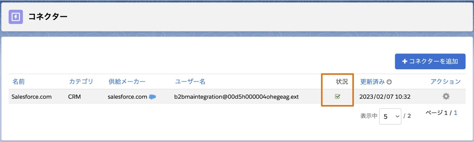 5.[Salesforce.com]コネクターの状況にチェックが入っていることを確認