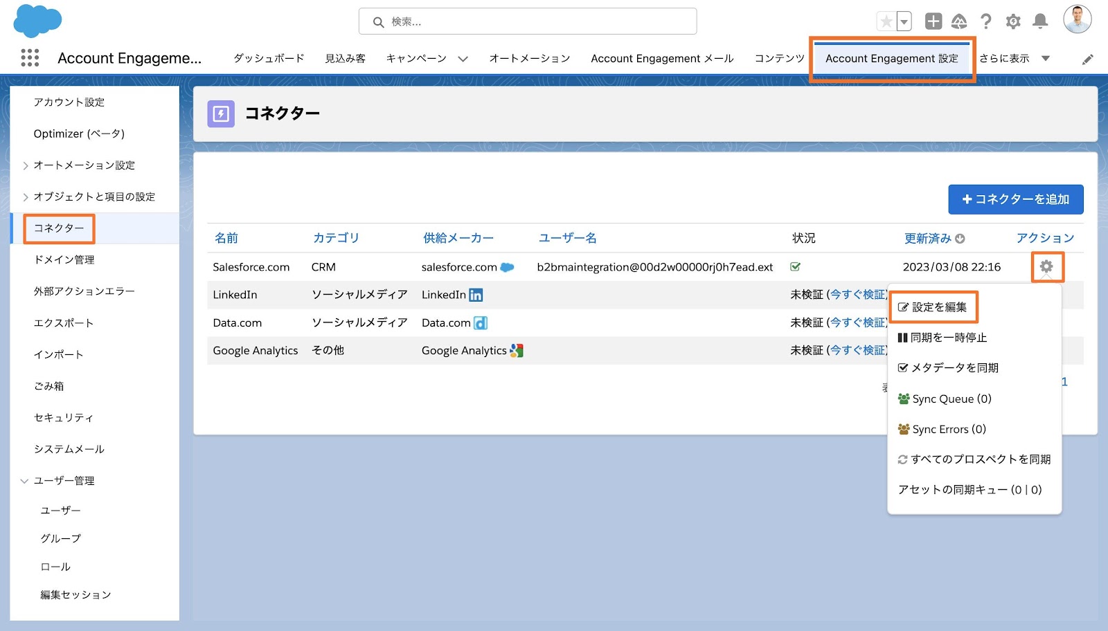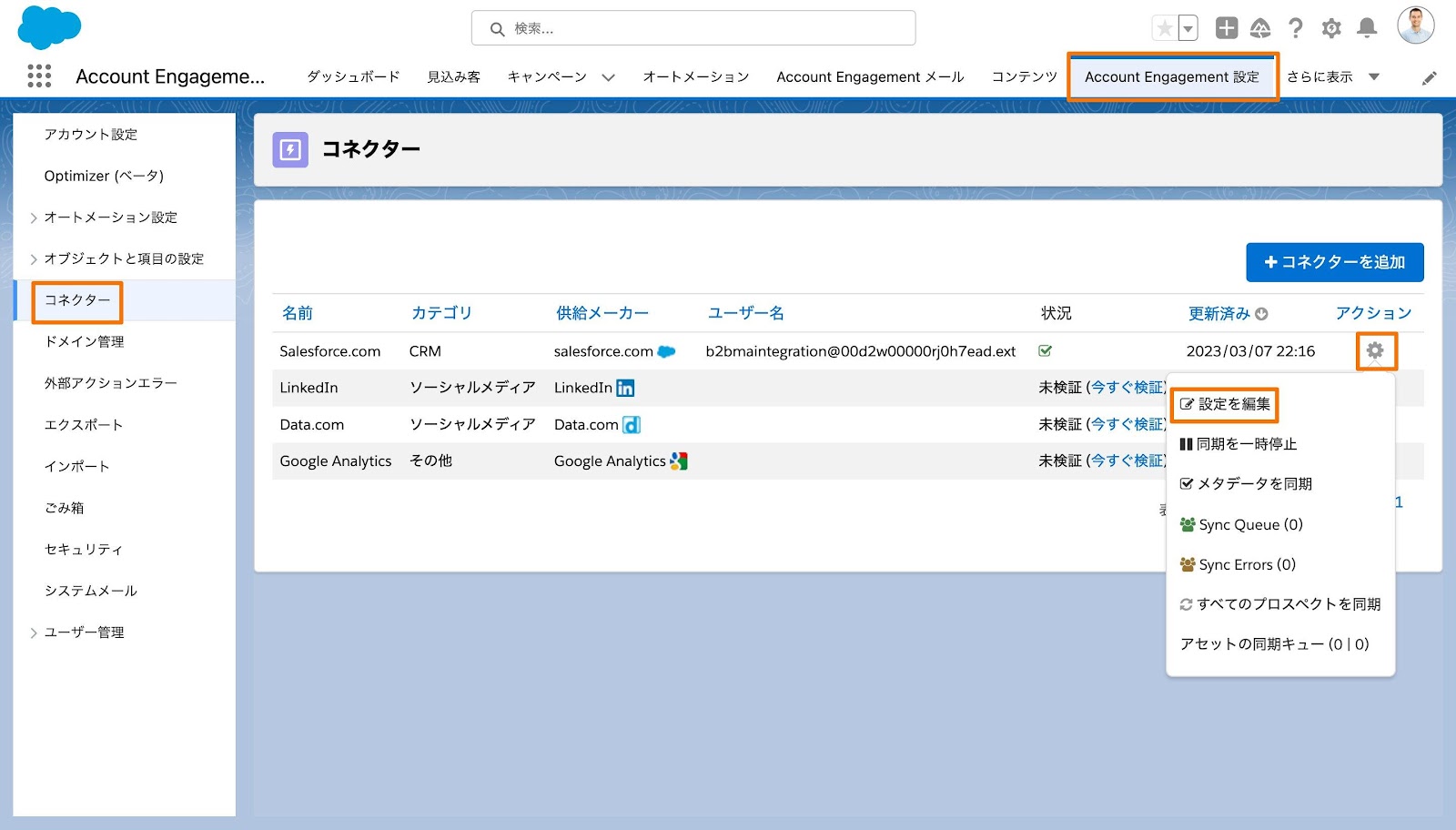 10. [Account Engagement設定]タブから[コネクター] > ギアアイコン > [設定を編集]をクリック