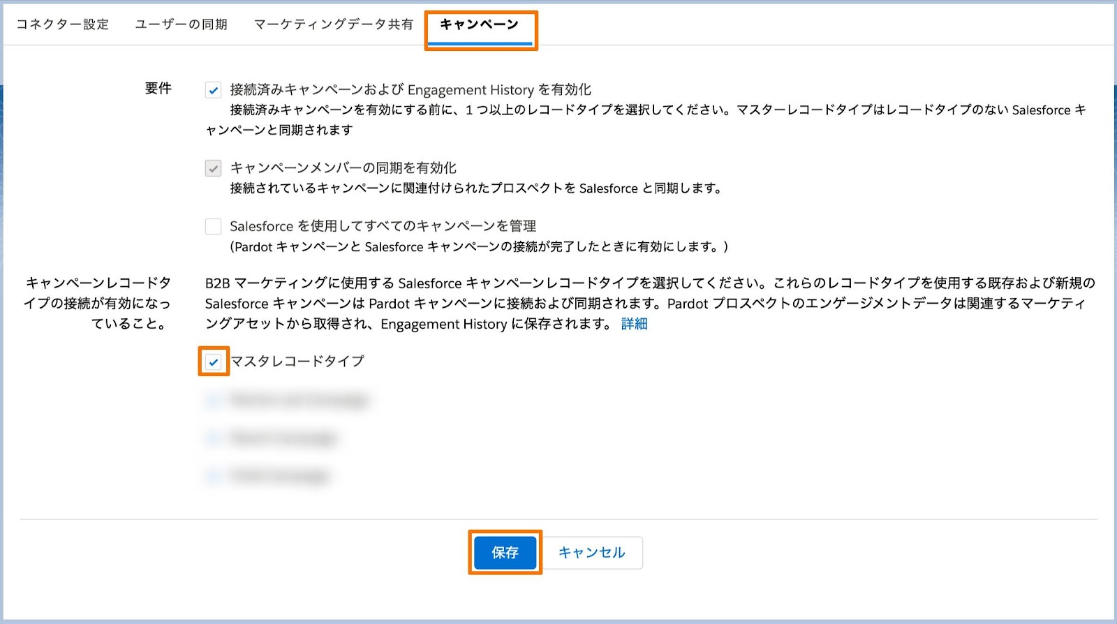 2. [キャンペーン]タブを開き、「接続済みキャンペーンおよびEngagemen Historyを有効化」にチェックが入っていることを確認。マスタレコードタイプにチェックを入れ、 [保存] をクリック。