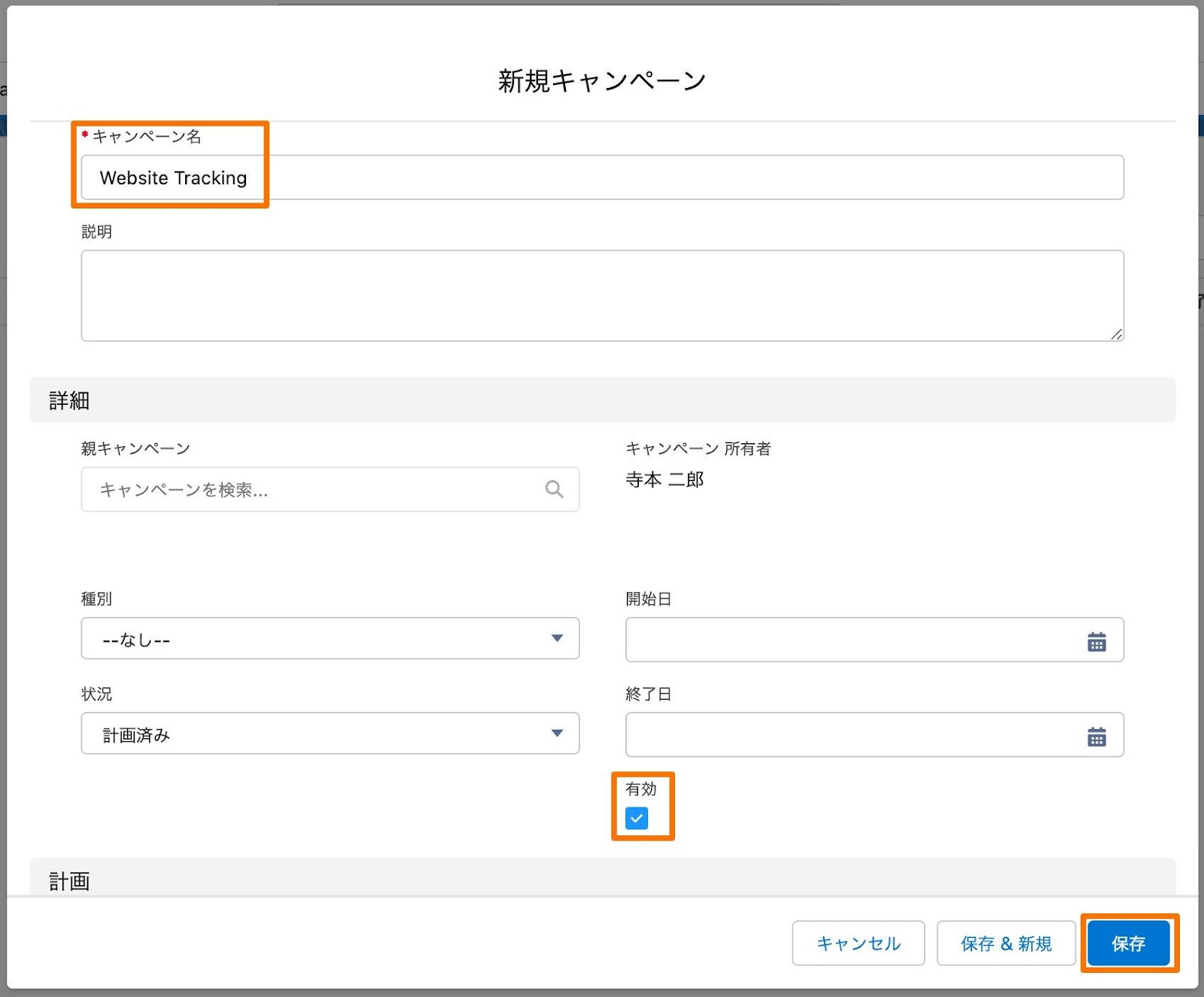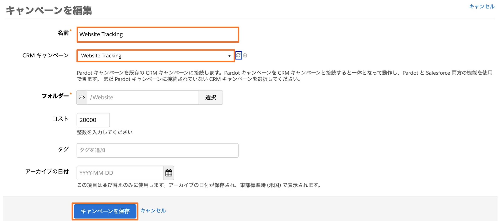 9. 「名前」に「Website Tracking」と入力し、「CRMキャンペーン」から「Website Tracking」を選択 > [キャンペーンを保存]をクリック