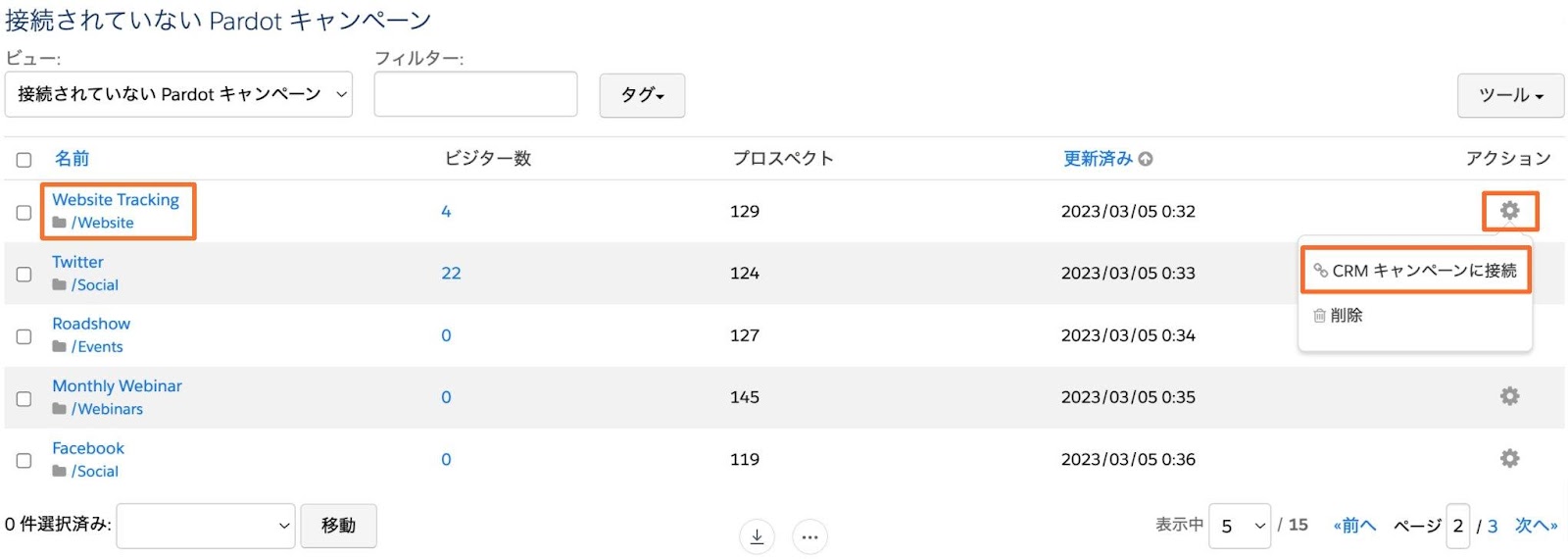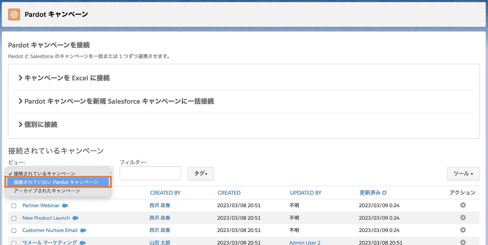 個別または一括で、未接続のAccount Engagementキャンペーンと