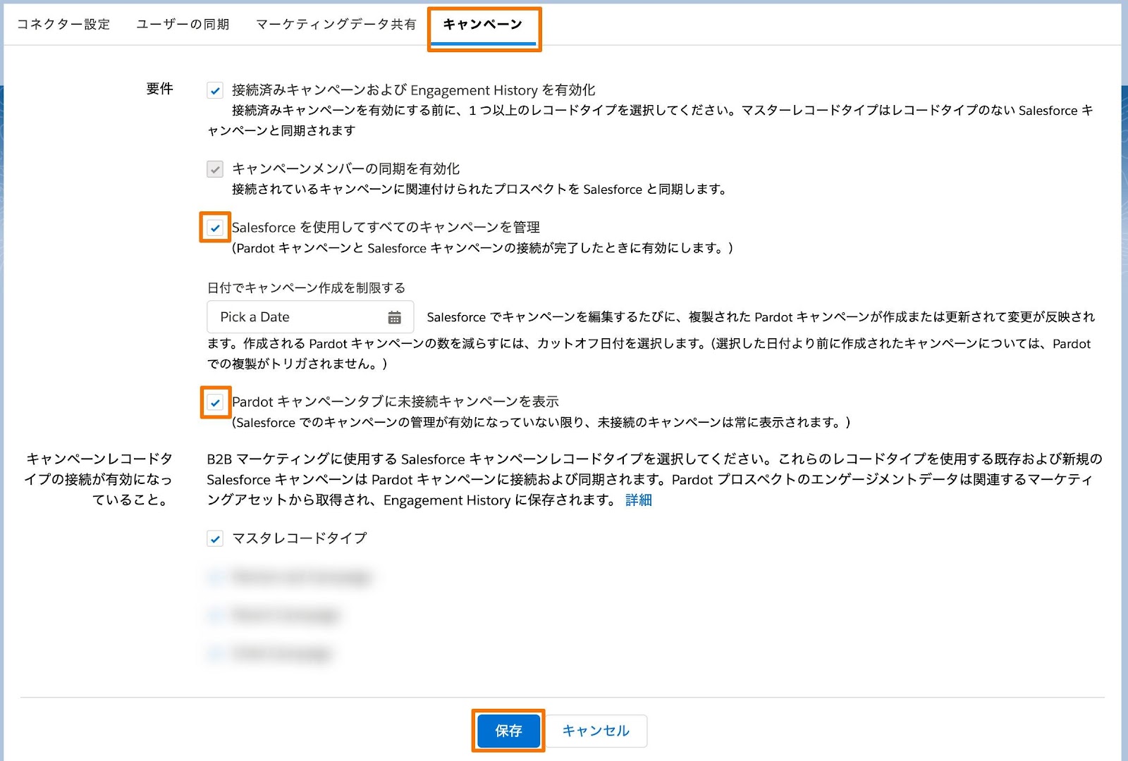 Salesforce側でキャンペーンのレコードタイプを複数利用している場合、そのレコードタイプ名が表示されます。チェックを入れることで、Account Engagementと接続させるキャンペーンのレコードタイプを指定することが可能です。