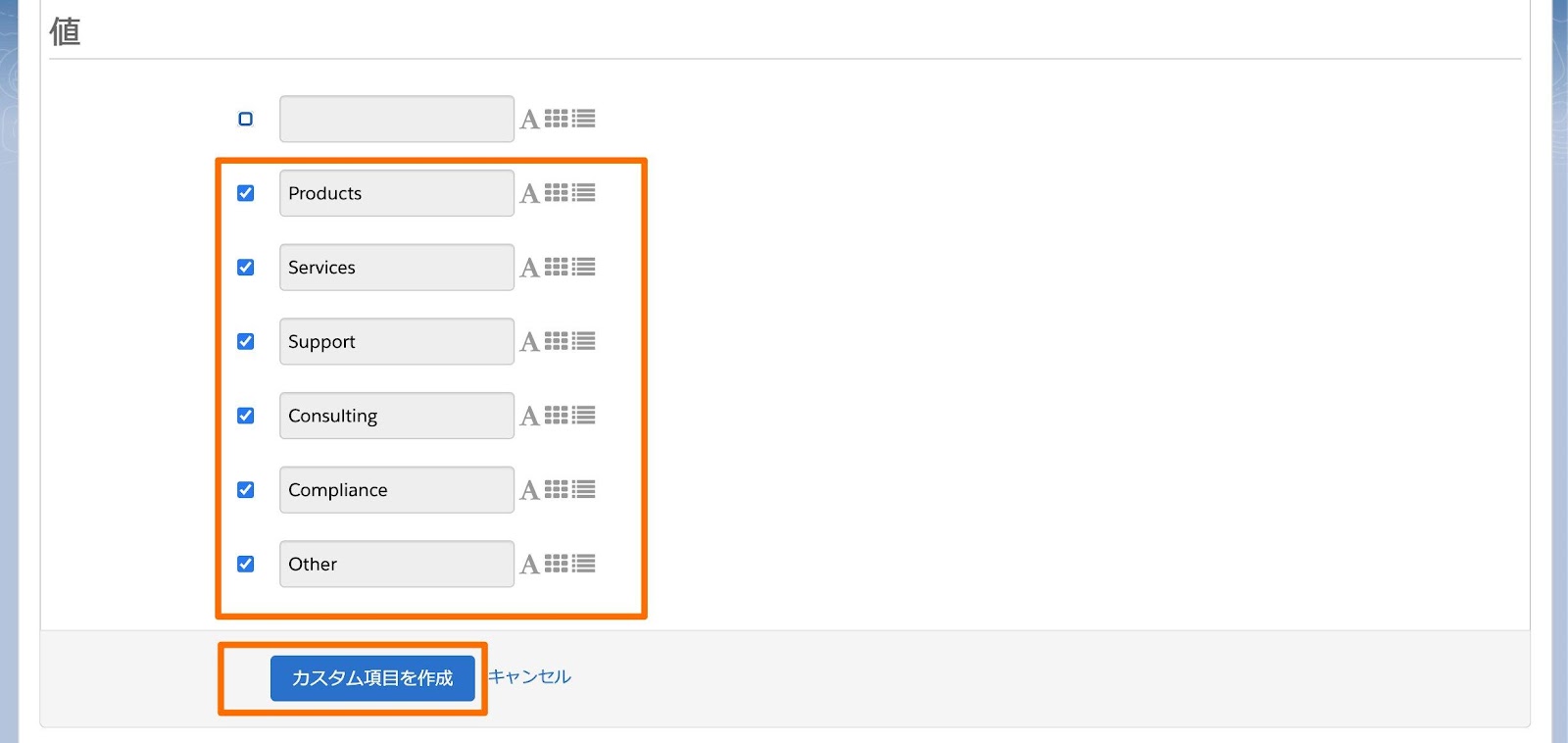 4. 3の手順でドロップダウンを選択した場合、画面下にスクロールして必要な項目が[値]に含まれているか確認し、[カスタム項目を作成]をクリック