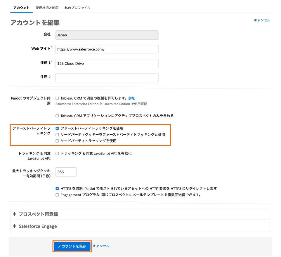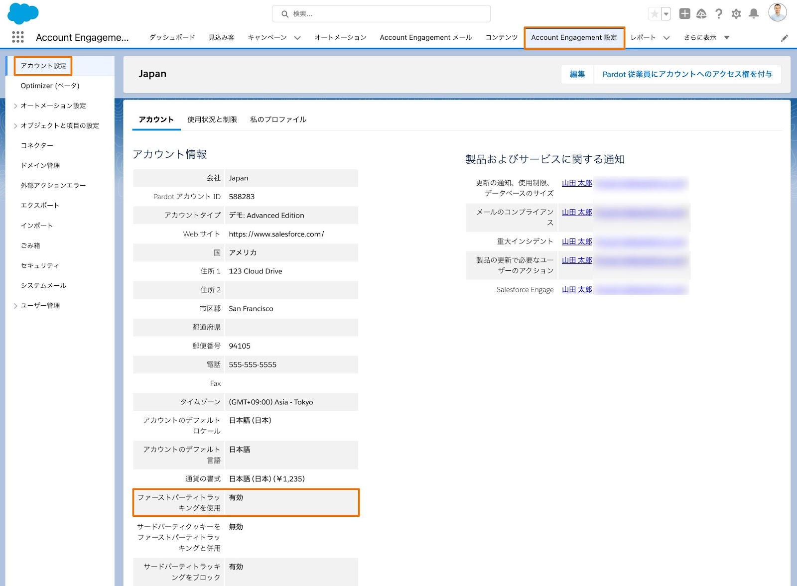 1. [Account Engagement] > [アカウント設定] から、「ファーストパーティトラッキングを使用」が「有効」になっていることを確認