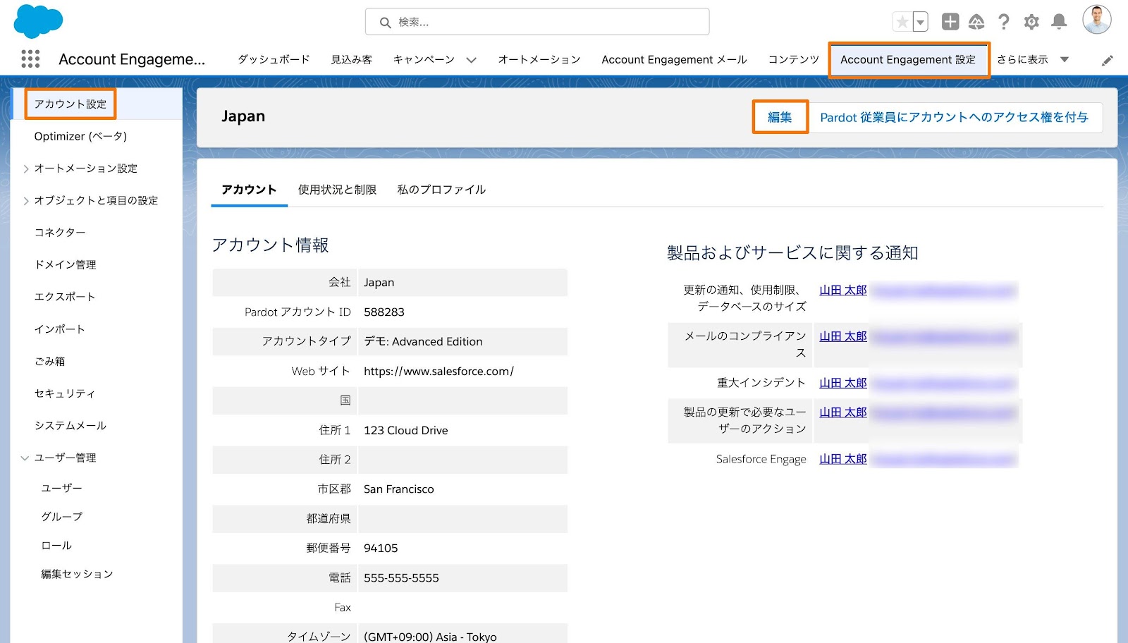 1.[Account Engagement設定]>[アカウント設定]> [編集] をクリック