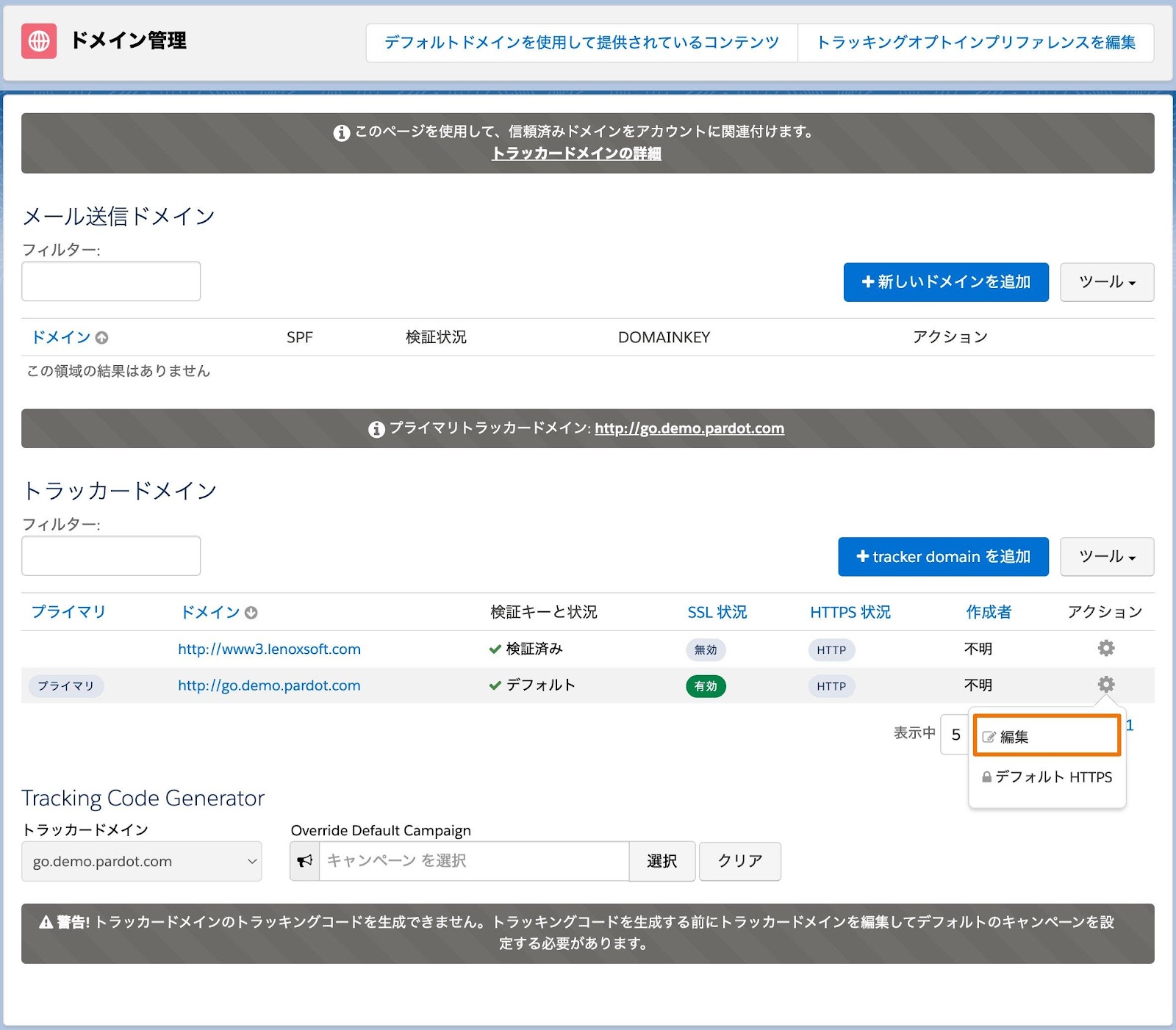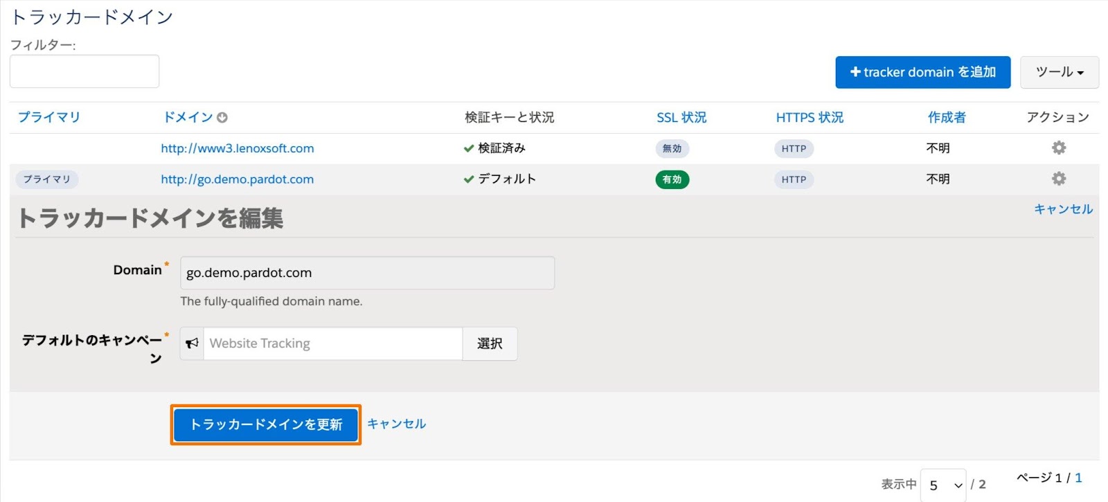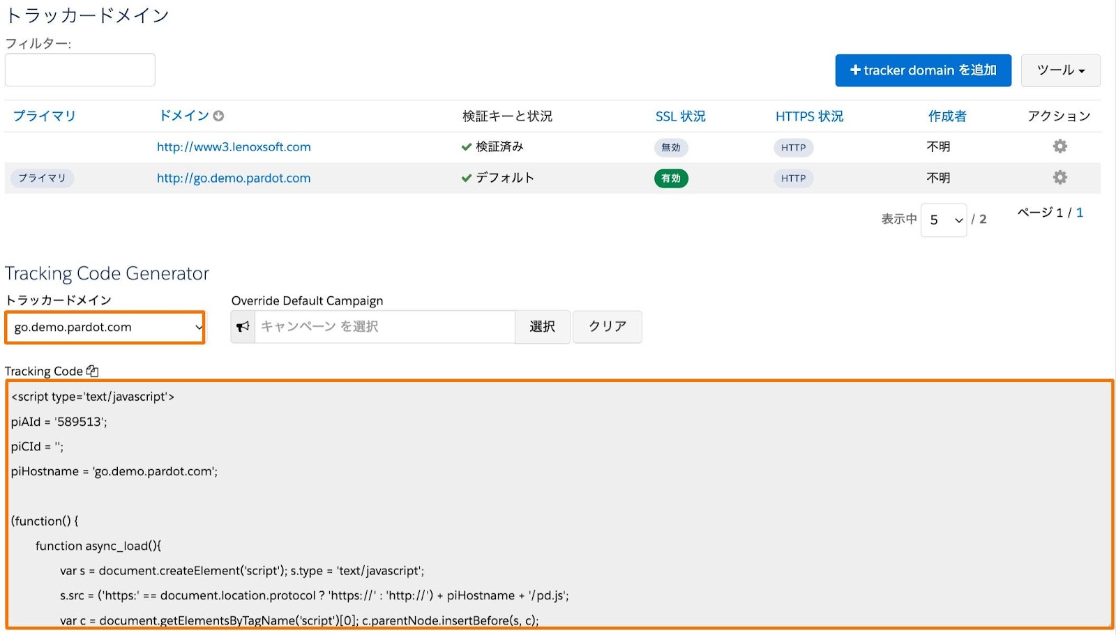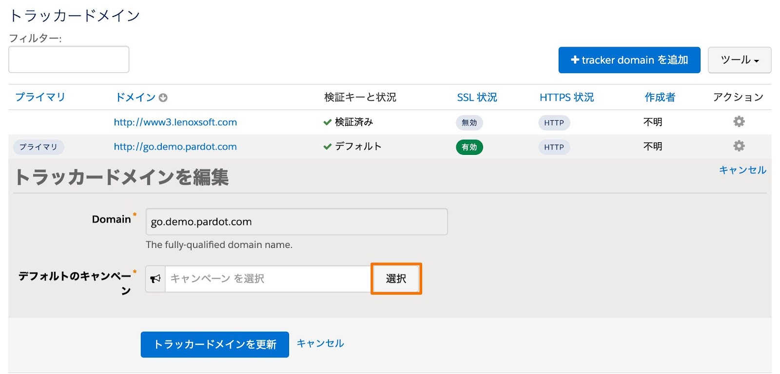 ※下記ではサンプルとして「go.demo.pardot.com」を選択しています。自社の該当のドメインをご選択ください。