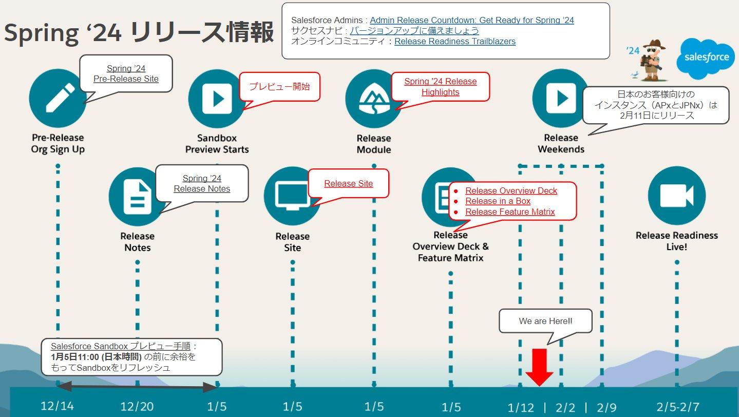 まずは次期バーションである Spring’24 のリリースに関する情報です。1月7日より Spring’24 の Sandbox プレビューが開始しております。本番組織に Spring’24 がリリースされる前に、プレビュー Sandbox にて動作確認や新機能の検証等を実施することを推奨しています。また Spring’24 に関する関連リソースとして、Release Site や Release Overview Deck 等が公開されています。これらの情報もご確認いただき、Spring’24 のリリースに向けたご準備をお願いします。