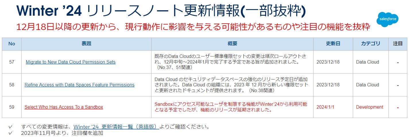 現行バージョンであるWinter ’24 のリリースノートの中から、12月18日以降の更新を抜粋してご紹介します。