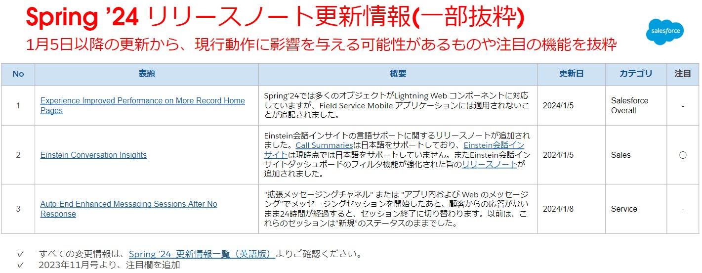 続いて次期バージョンであるSpring ’24のリリースノートの更新情報です。