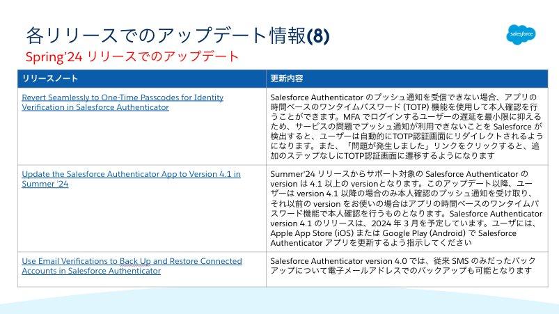 Salesforce Authenticator version 4.1 のリリースは、2024 年 3 月を予定しています。ユーザー様には、Summer ‘24リリースの前(今年6月)までにApple App Store (iOS) または Google Play (Android) で Salesforce Authenticator アプリを最新版に更新するよう周知をお願いします。