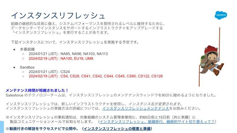 主に海外のお客様にご利用いただいているインスタンスになりますが、NA100, EU16, UM8のインスタンスで、2月18日(日本時間)にインスタンスリフレッシュが実施される予定です。また、同じ日程で、CS4等のスライドに記載されているSandboxのインスタンスリフレッシュも実施予定です。