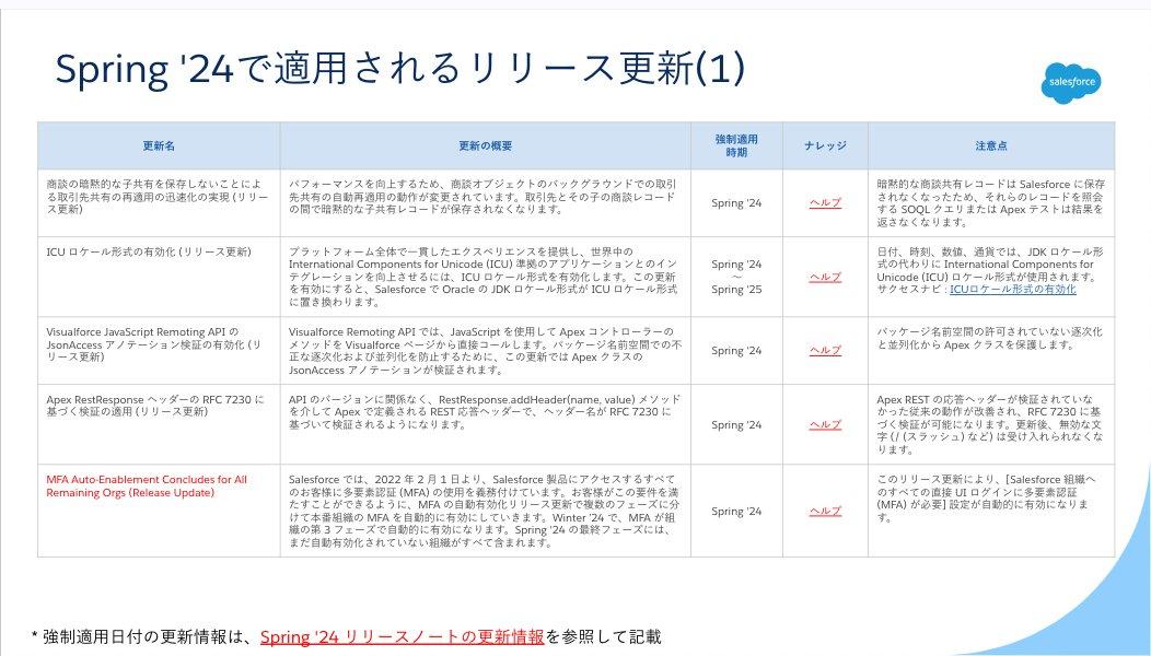 続いて、次期バージョンであるSpring ‘24で適用予定のリリース更新のご紹介です。