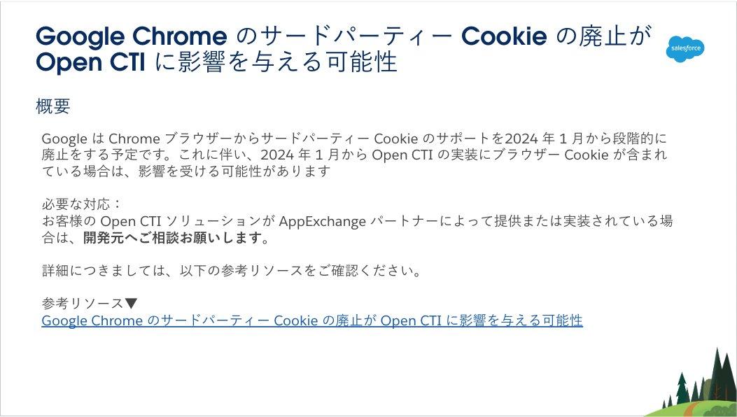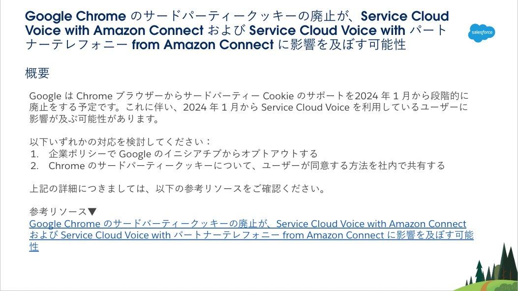 こちらも以前からご紹介している「Google Chrome のサードパーティー Cookieの廃止がService Cloud Voiceに影響を与える可能性」についてです。
