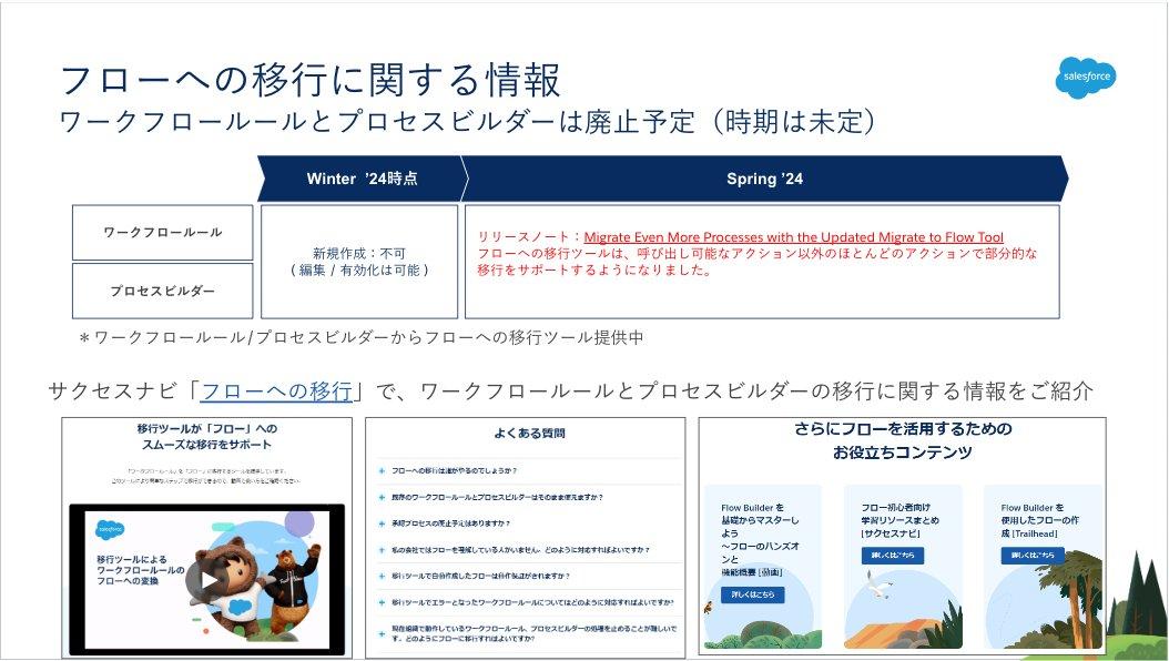 現在ワークフロールールとプロセスビルダーは新規作成することができません。それに伴いワークフロールールとプロセスビルダーからフローへの移行ツールが提供されています。Spring ‘24では、フローへの移行ツールがアップデートされ、呼び出し可能なアクション以外のほとんどのアクションで部分的なフロー移行がサポートされるようになりました。詳細は、本スライドのリンクをご覧下さい。