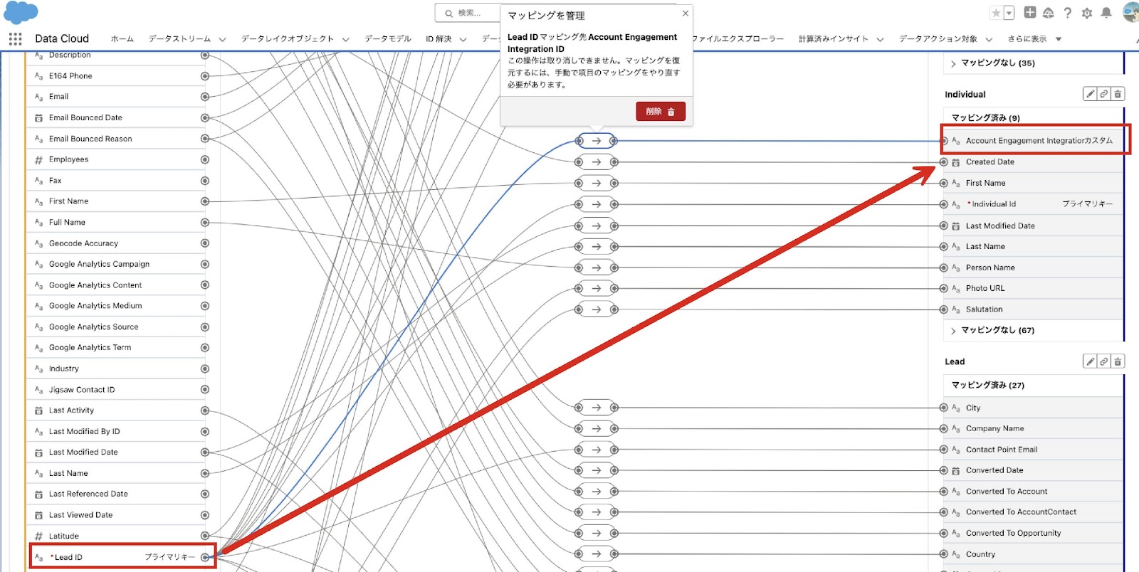 - 注意:マッピング設定にて、Individual DMO の鉛筆アイコンより [Account Engagement Integration ID] モデル項目を作成し、リード (取引先責任者) ID 項目をマッピング