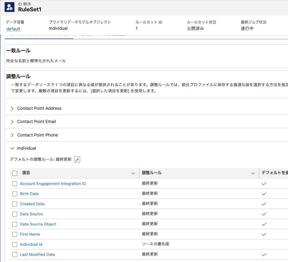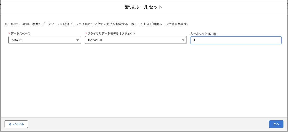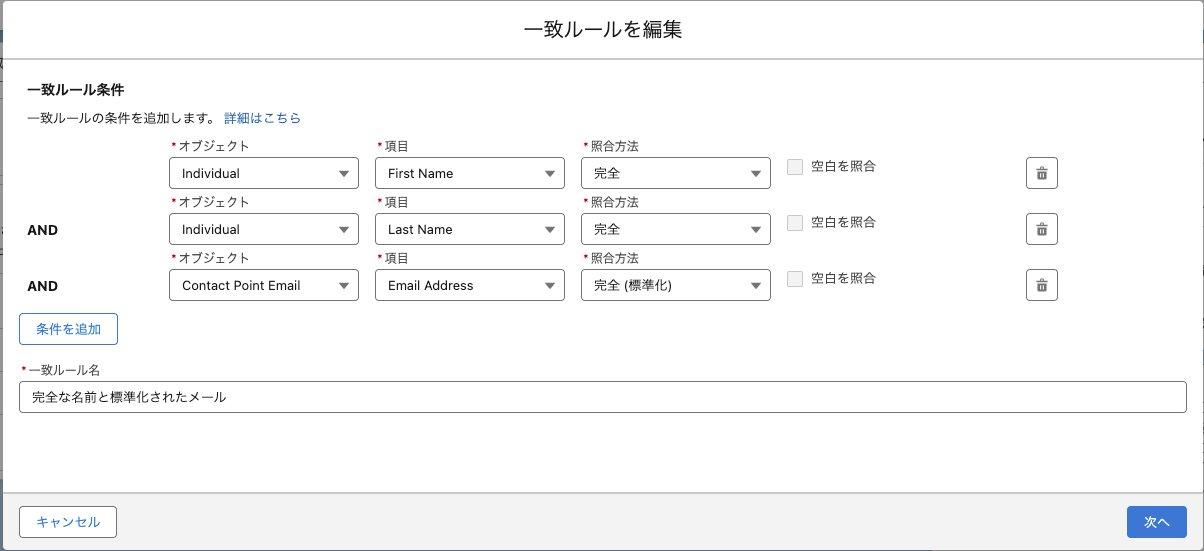 余計なデータを取り込まないようにデータソース側 (本件では Salesforce) であらかじめ不要なレコードを整理することが推奨されますが、Data Cloud 内でも一致ルールを定義することで取り込んだ重複した顧客レコードを一つの統合個人 (Unified Individual) に統合することが可能です。