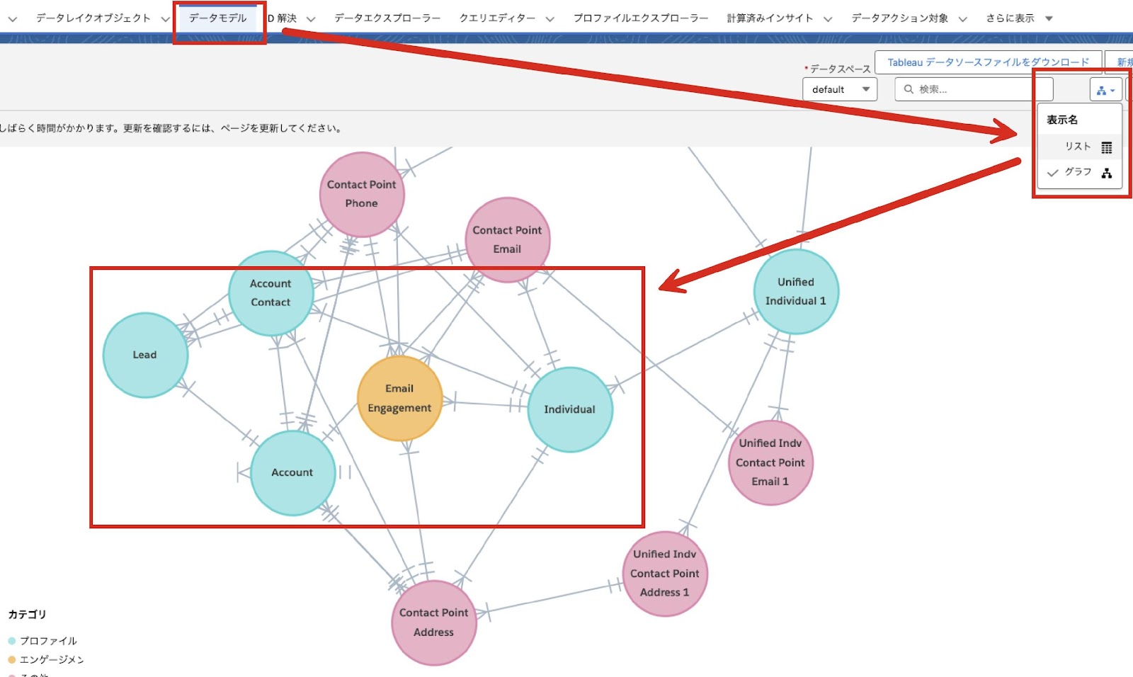 例えば以下の赤枠からは、Salesforce から取り込んだ取引先責任者 (Account Contact) は直接 Data Cloud の Individual (個人) に紐づいており、リードは取引先責任者 (Account Contact) を介して間接的に Individual (個人) と紐づいていることがわかります。