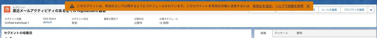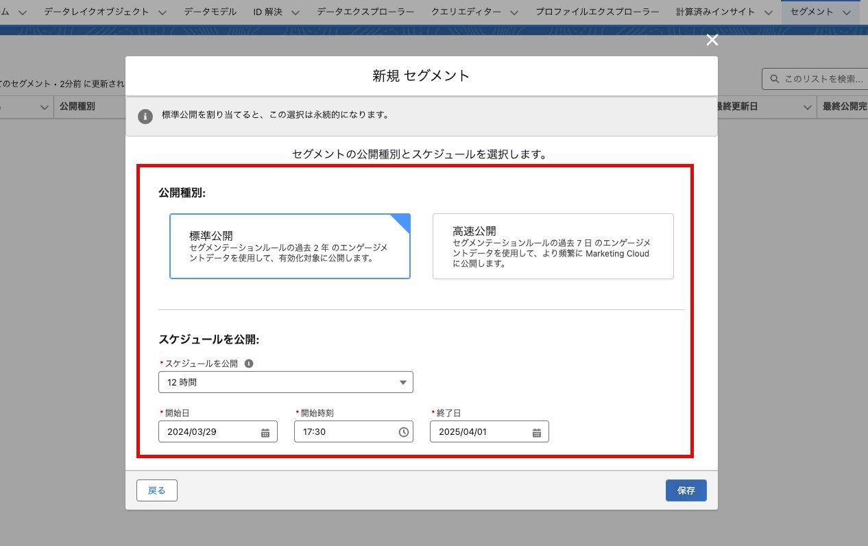 セグメントの作成は方法は【 Trailhead : セグメンテーションと有効化 】が参考になりますので、一読をおすすめします。
