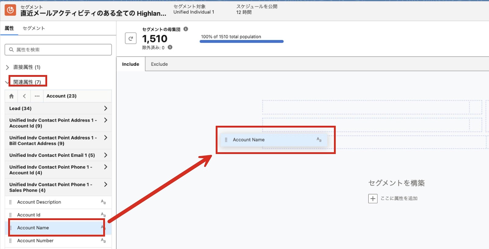 - 左側パネルの [関連属性] より [Account Contact] > [Account] と辿り、[Account Name] 項目を右側にドラッグアンドドロップ