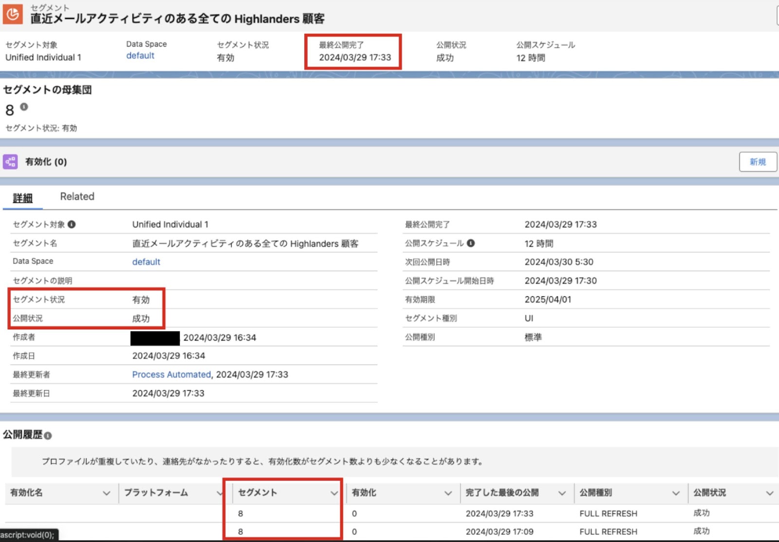 セグメントの公開が完了すると、[公開履歴] に抽出されたレコードが確認できます。