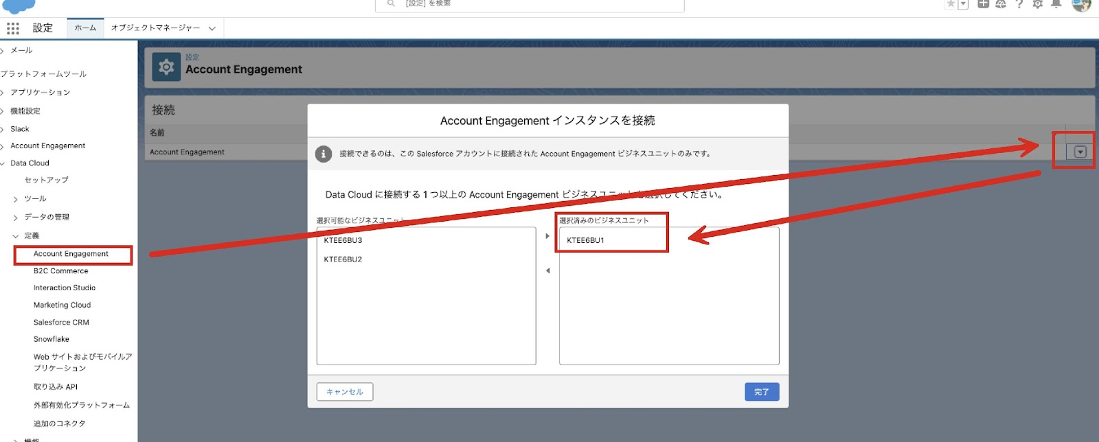 - 接続する Account Engagement ビジネスユニットを [選択されたビジネスユニット] 列に追加し、[完了] をクリックします。