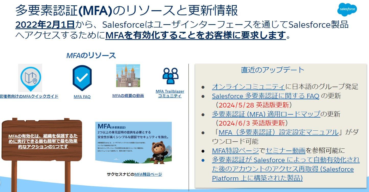 Sales Cloud などの Salesforce Platform 上に構築された製品に対する MFA の自動有効化が Summer ’24 のリリースで実施され、これを以って Salesforce による MFA の適用プログラムは終了します。