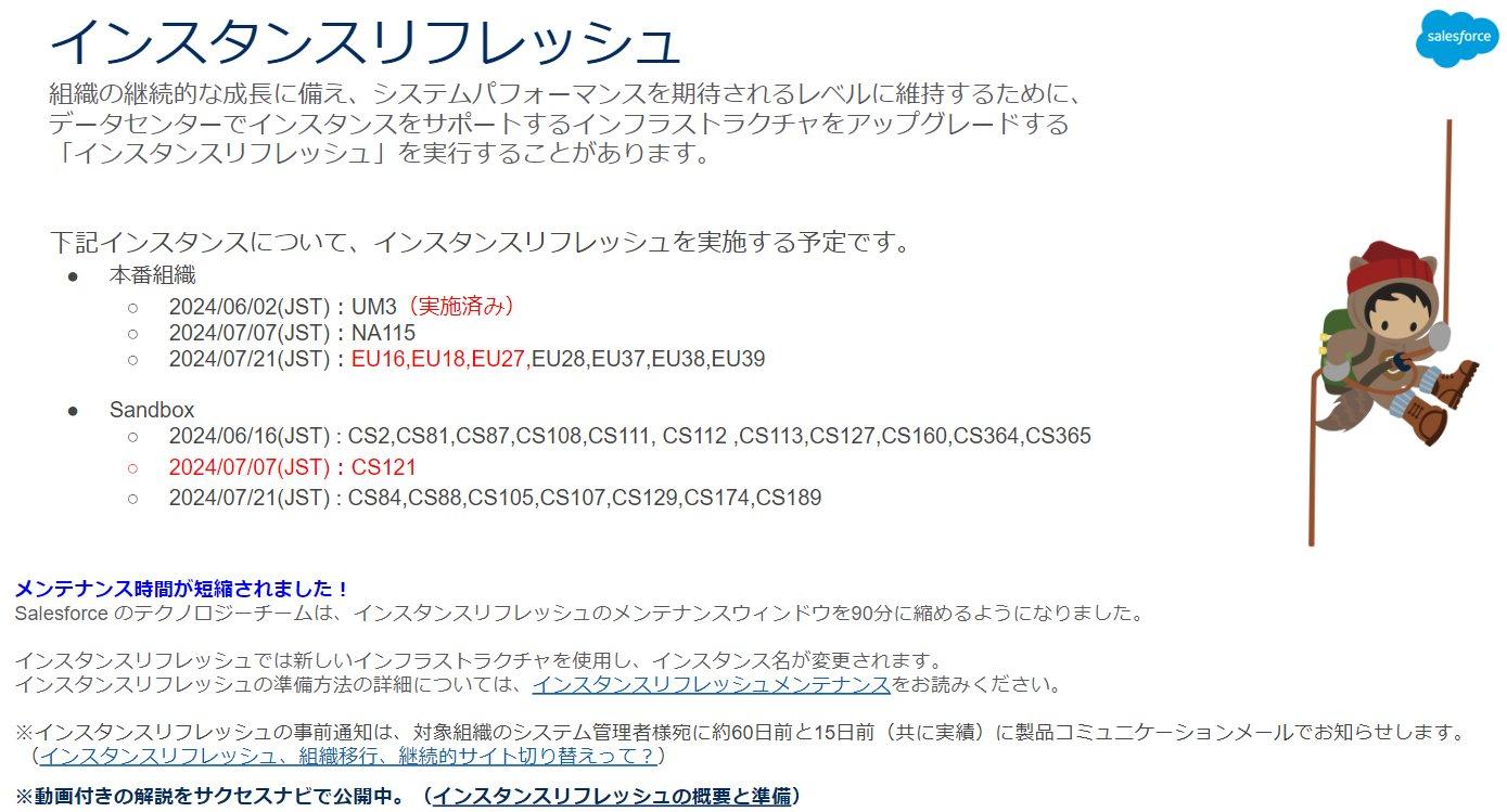 主に海外のお客様にてご利用いただいているインスタンスがメインですが、こちらに記載されている日程にて本番組織、Sandbox 組織ともにインスタンスリフレッシュが予定されています。お手元に Trust サイトからメンテナンスの通知が届いているお客様は事前のご準備をお願いいたします。