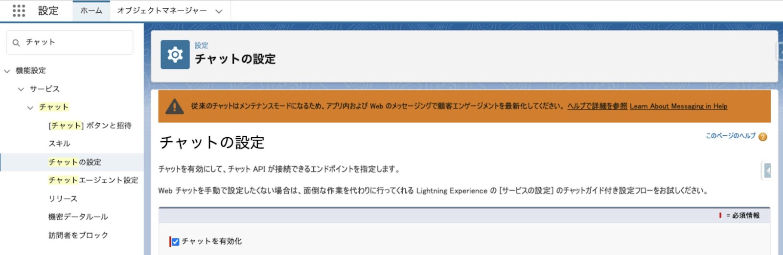 [チャットを有効化]がONになっている場合、従来のチャットサービス (Live Agent)をご利用可能な状態です。