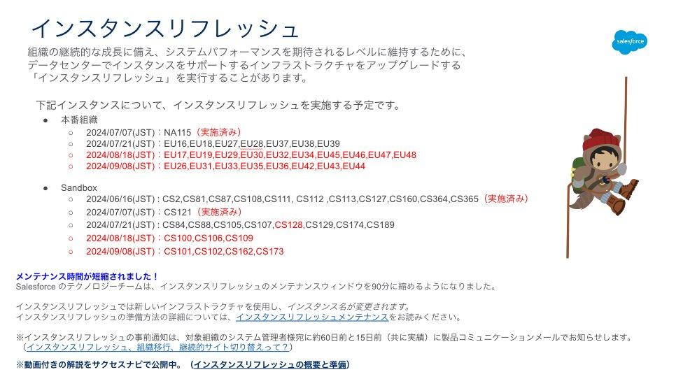 主に海外のお客様にてご利用いただいているインスタンスがメインですが、こちらに記載されている日程にて本番組織、Sandbox 組織ともにインスタンスリフレッシュが予定されています。お手元に Trust サイトからメンテナンスの通知が届いているお客様は事前のご準備をお願いいたします。
