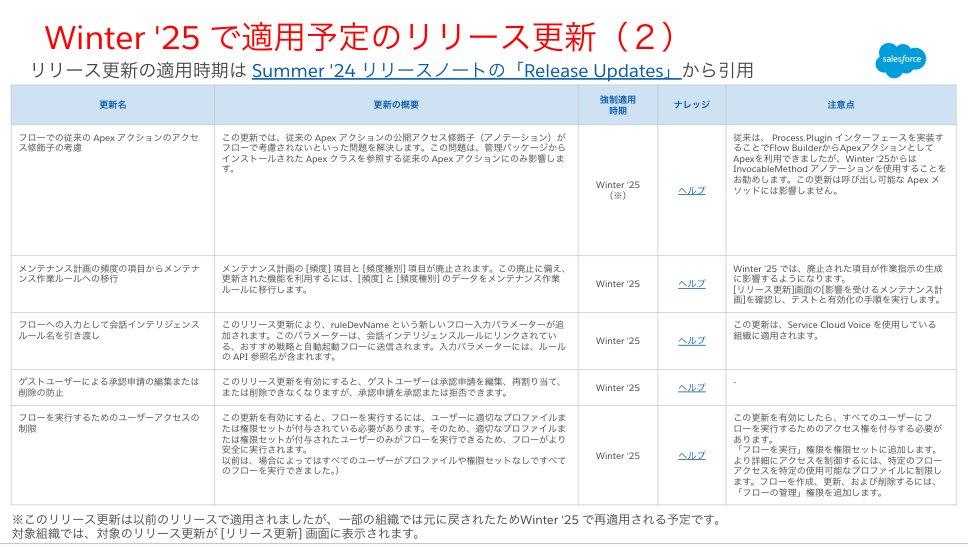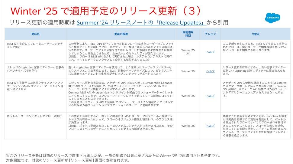 ボットで開始されたフローについて、ボットに紐付けられたユーザーのプロファイルや権限セット・共有ルールに基づいて、フローのオブジェクトや項目に対するアクセス権が決定されるリリース更新の強制適用時期が Winter ’25 に延期された旨がリリースノートに追加されました。