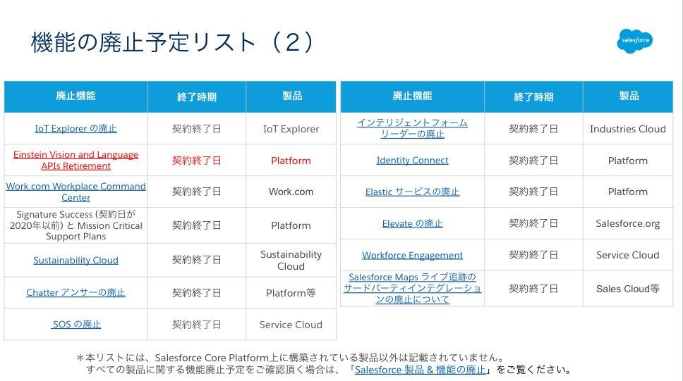 こちらは明示的な廃止時期はなく、既存契約の終了日までは 「Einstein Vision および Language」 をご利用いただけます。