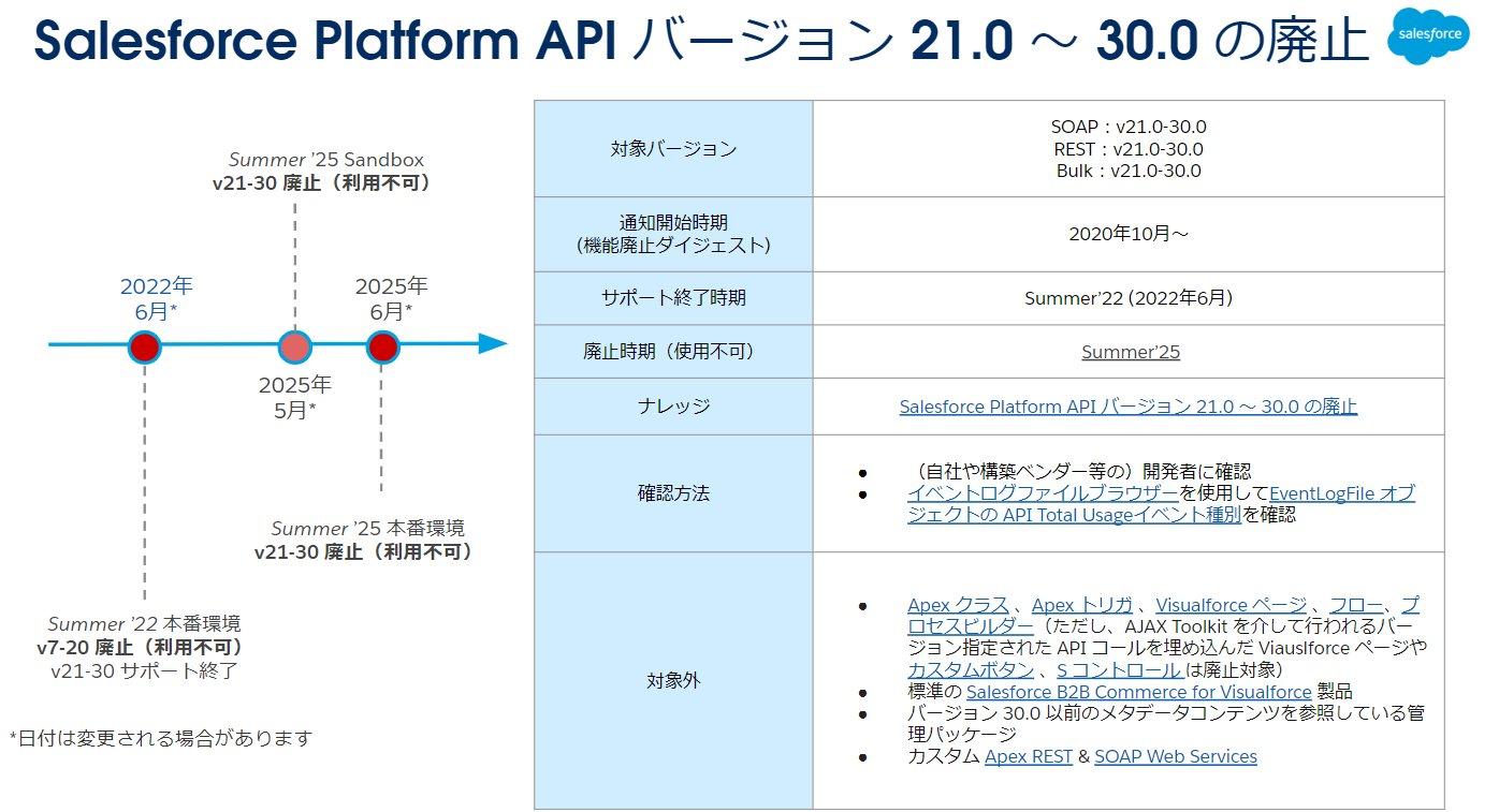 Salesforce Platform API バージョン 21.0 ~ 30.0 の廃止が、Summer '25( 2025 年 6 月)に予定されています。