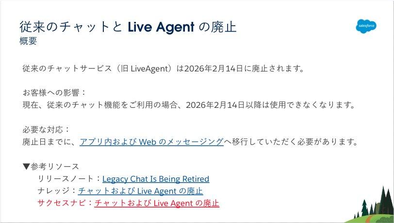 また、今回、参考リソースとして、サクセスナビの「チャットおよび Live Agent の廃止」が追加されておりますので、ぜひご確認ください。