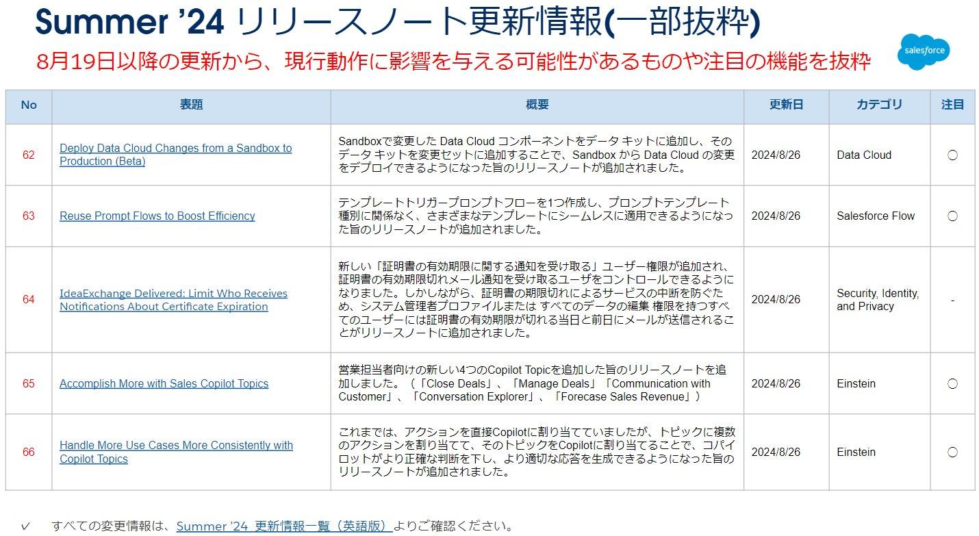まずは、Summer ’24 のリリースノート更新情報です。