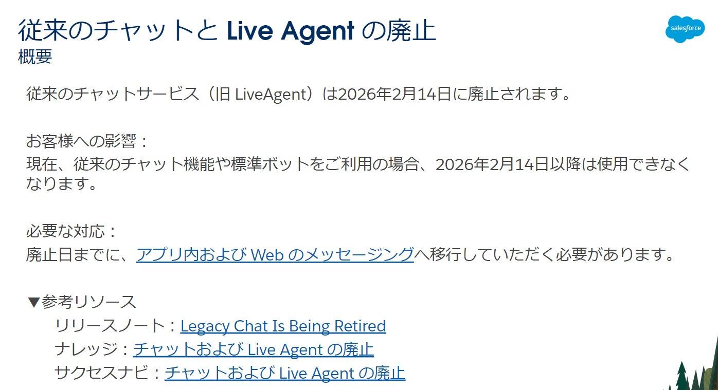 従来のチャットや Live Agent をご利用中のお客様は、既に製品コミュニケーションメールを受けとられていると思います。従来のチャット機能や標準ボット機能をご利用の場合、2026 年 2 月 14 日に廃止され、それ以降は機能をご利用いただくことはできません。