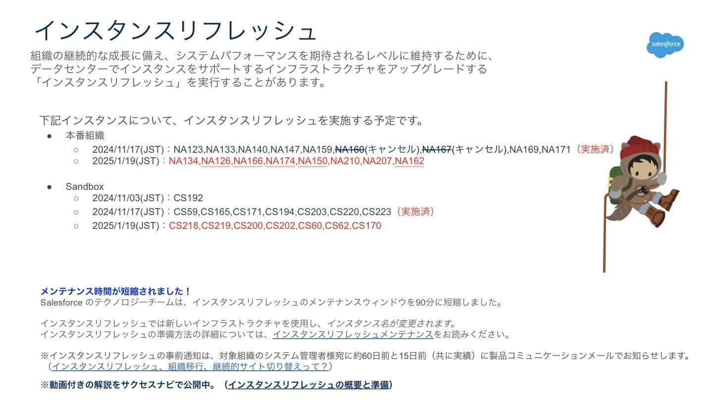 主に海外のお客様にてご利用いただいているインスタンスがメインですが、上記の日程にて本番組織、Sandbox 組織ともにインスタンスリフレッシュが計画されています。お手元に Trust サイトからメンテナンスの通知が届いているお客様は事前のご準備をお願いいたします。