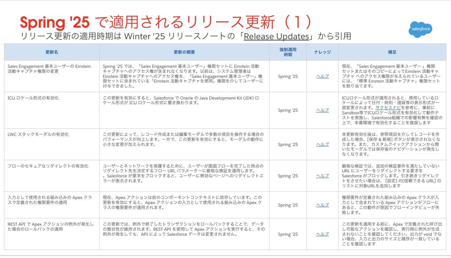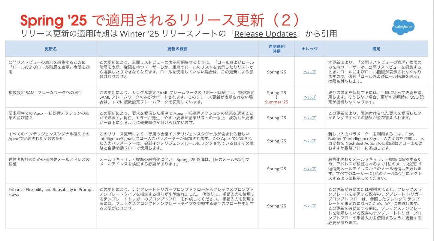 Spring ’25 に適用されるリリース更新の中から、影響度が高いと思われるものをピックアップしてご紹介します。