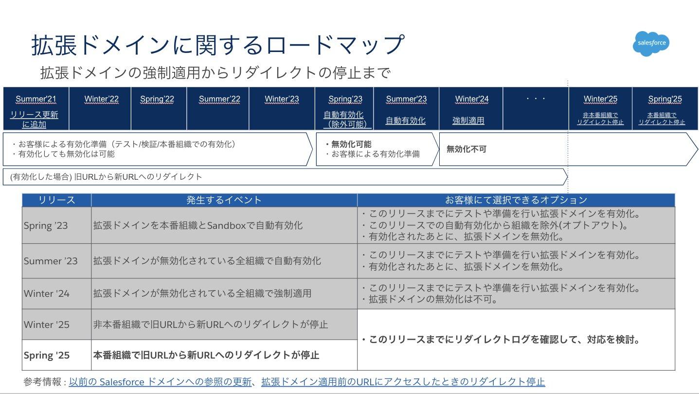 Winter ’25 で予定通り本番以外の組織で、拡張ドメイン有効化前の旧 URL にアクセスした際の新しい URL へのリダイレクトが停止されました。本番組織のリダイレクトは Spring ’25 で停止予定です。サクセスナビにリダイレクト停止までの推奨アクションがまとめられておりますので、停止に向けた準備にお役立てください。