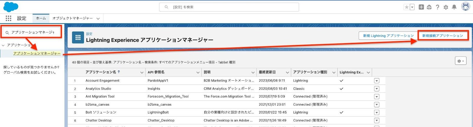 Account Engagement APIを使用する事前準備として、SalesforceユーザーによるOAuth認証を行うために、Account Engagement API用の「接続アプリケーション」の設定を作成します。