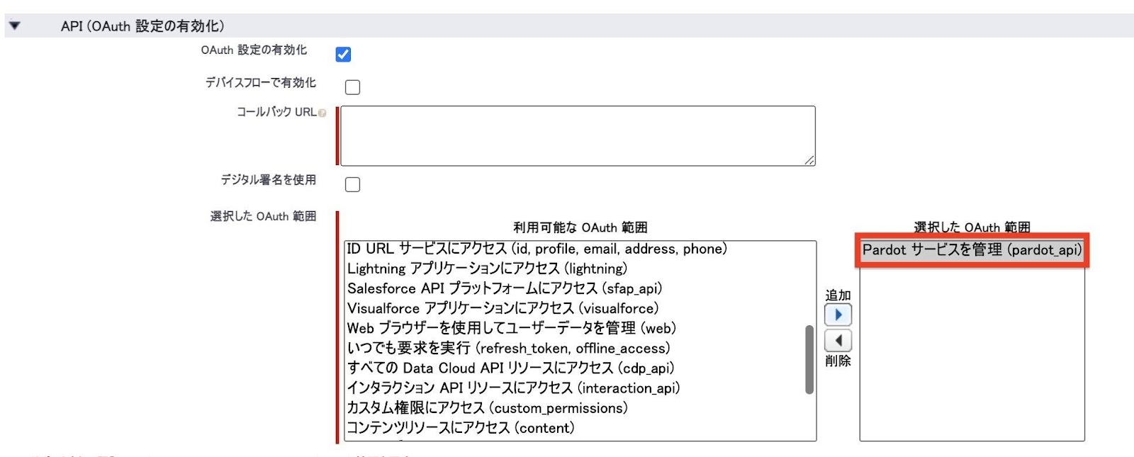 7.[選択した OAuth 範囲]セクションで、[Pardot サービスを管理(pardot_api)]を選択して[追加]します。