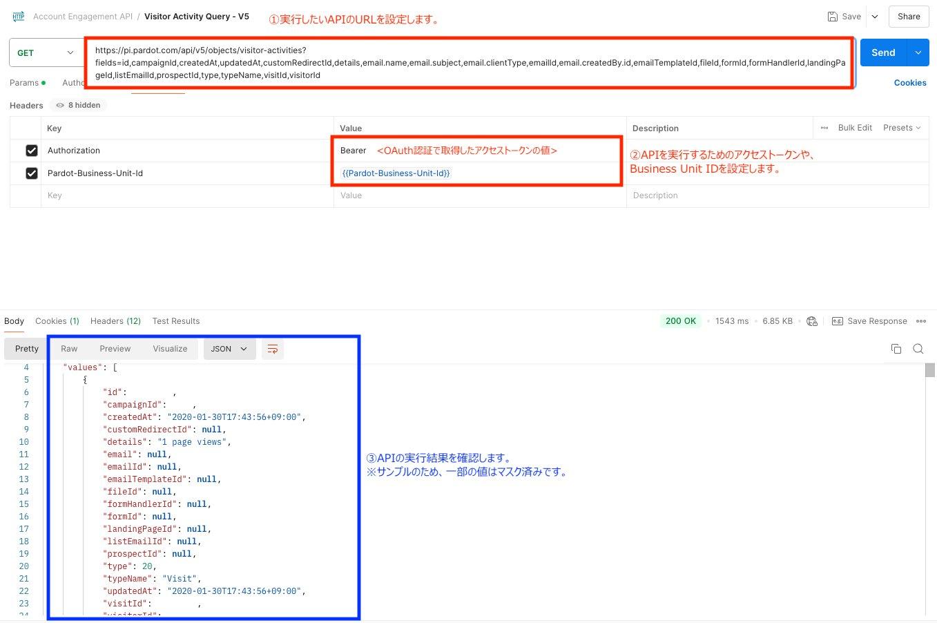 そのアクセストークンの値を[Authorization]ヘッダに設定し、併せてAccount EngagementビジネスユニットIDの値を[Pardot-Business-Unit-Id ]ヘッダにそれぞれ設定することで、Account Engagement APIの実行が可能となります。