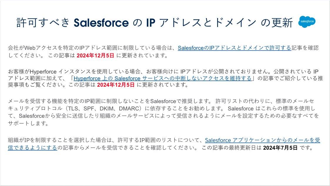 - 「SalesforceのIPアドレスとドメインで許可する」および「Hyperforce 上の Salesforce サービスへの中断しないアクセスを維持する」