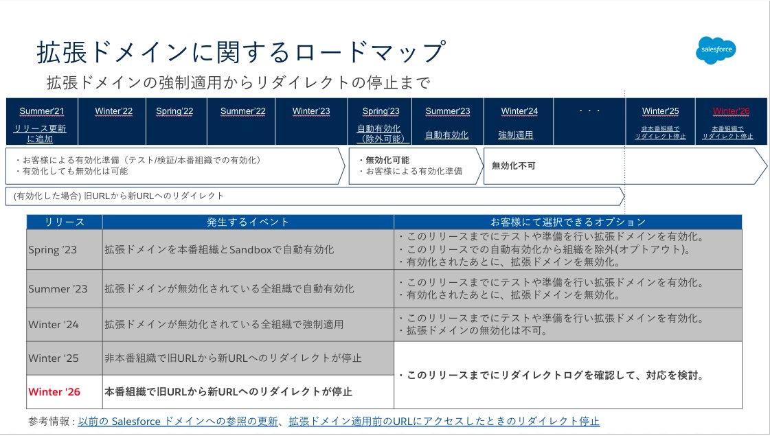 Winter '26 で、拡張ドメイン適用前のURLに関するリダイレクトがすべての本番環境で終了することに関連し、リリースノートが更新されました。