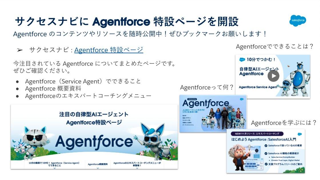 Agentforce の第一弾である Service Agent でできることを解説した動画や Agentforce の概要資料、また、これからSalesforce の AI を活用していきたいとお考えのお客様にぜひ受講いただきたいエキスパートコーチングがまとめられております。随時更新されておりますので、ぜひブックマークしてご覧ください。