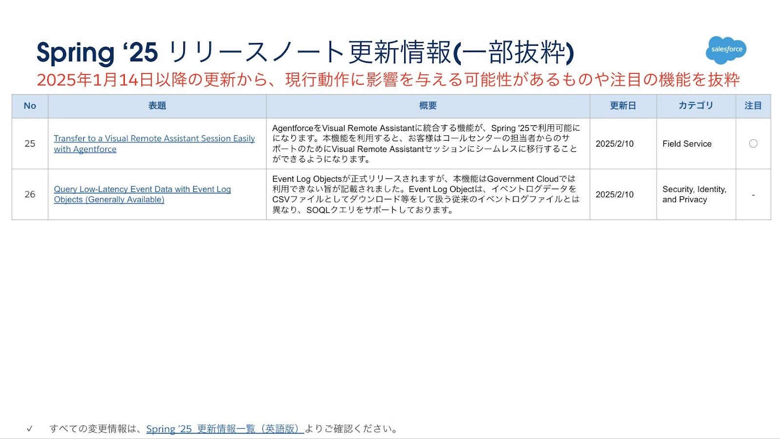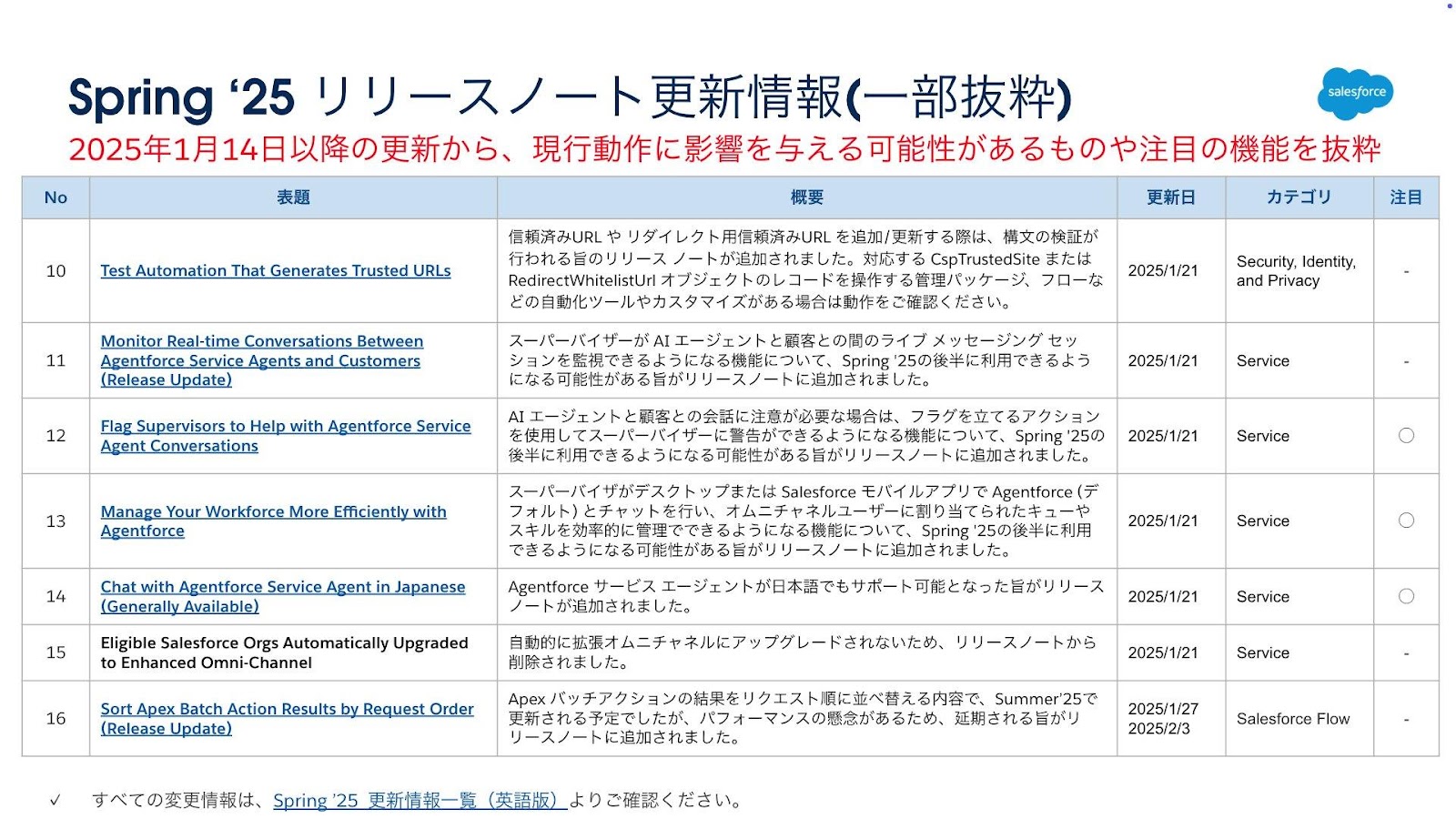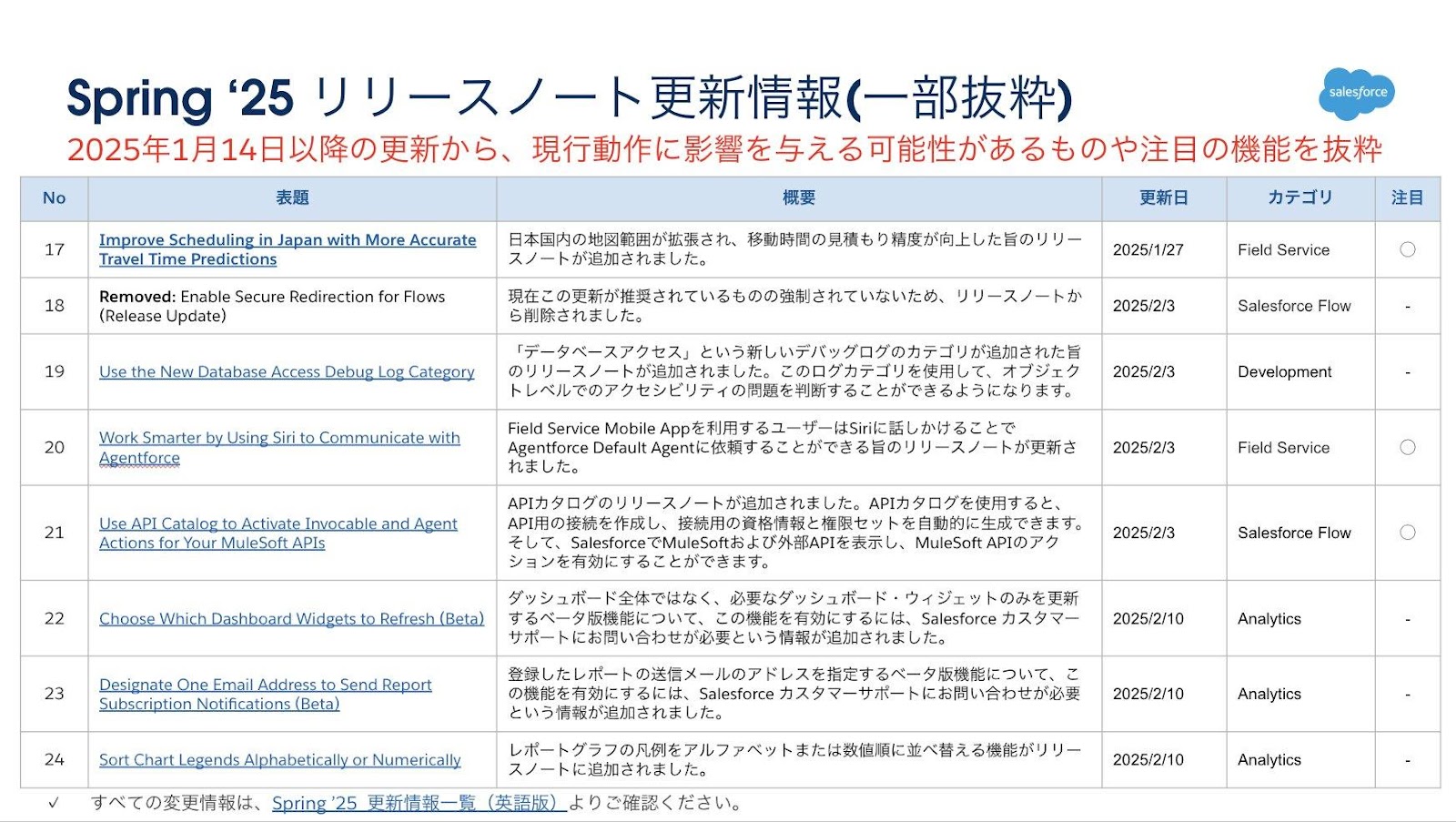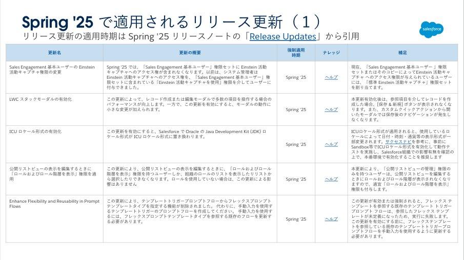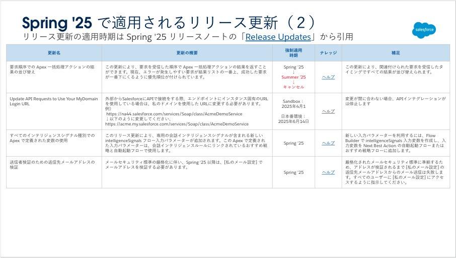 先日実施されました Spring ’25 リリースで適用されたリリース更新についての情報です。こちらは既に適用済となっております。