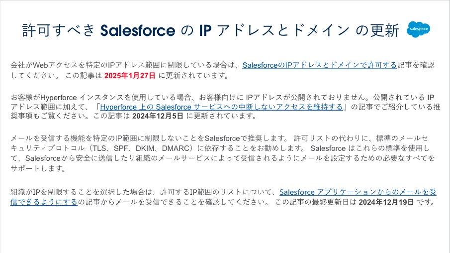 数年前から Salesforce では、新しいインフラである Hyperforce へお客様の組織を順次移行しています。Hyperforce への移行に関するメールを受け取られた場合には、事前準備が必要になる場合があります。そのため、Salesforce からメールを受信された場合は、内容のご確認をお願いいたします。
