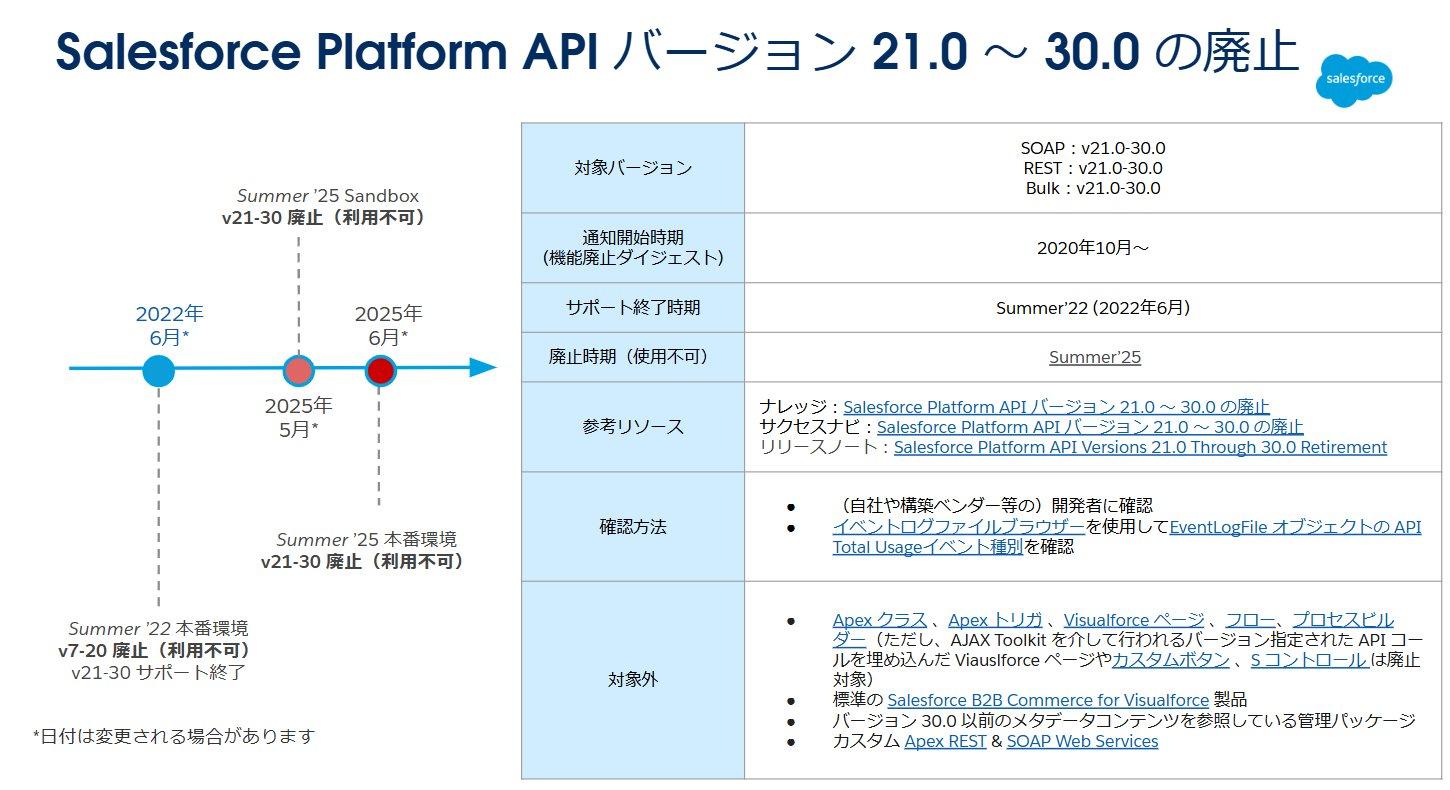 Salesforce Platform API バージョン 21.0 ~ 30.0 の廃止が、Summer ’25 (今年の 6 月)に予定されています。