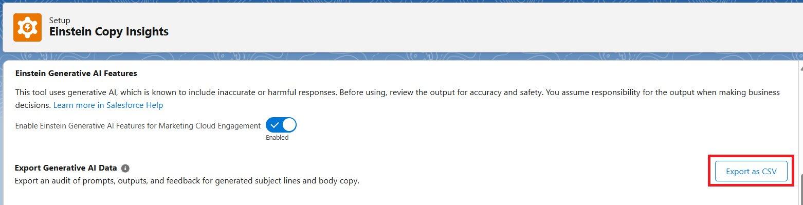 Einstein Copy Insights の生成 AI エクスポート監査ファイルには、入力値(inputs)、出力値(outputs)、およびユーザーフィードバック(user feedback)を含め、過去90日間の生成コンテンツが追加されます。