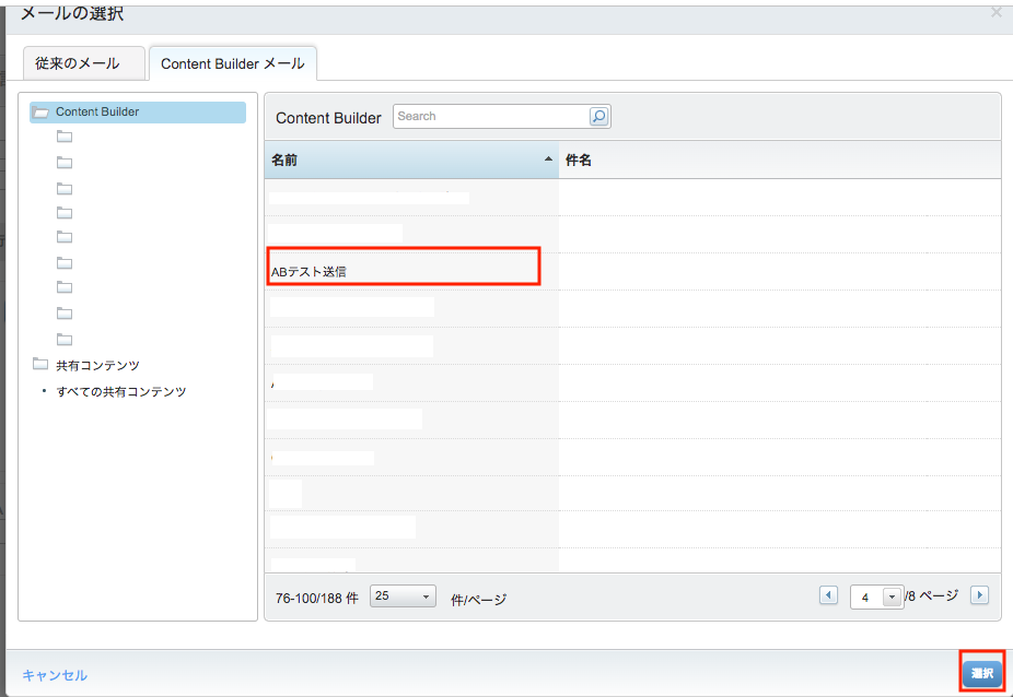 - (”件名行”でテストをする場合)メールの右にある選択をクリックし、テストするメールをクリックし選択